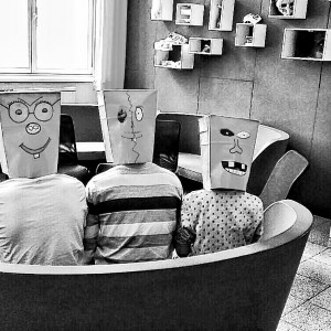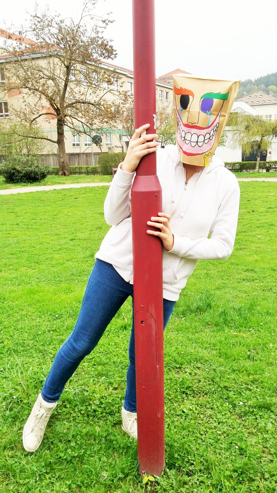 Diese der Maske innewohnende Ambivalenz wurde im BE-Unterricht fotografisch in Szene gesetzt. Inspiriert von Saul Steinbergs und Inge Moraths „Masquerade“ gestalteten die Schülerinnen und Schüler der 4A und 4C Masken, die einen gesteigerten Gesichtsausdruck beinhalten sollten. Bei den anschließenden fotografischen Selbstinszenierungen sollten sie mit unterschiedlichen Handlugen und Perspektiven experimentieren und dies in Form von Einzel- und Gruppenporträts festhalten.